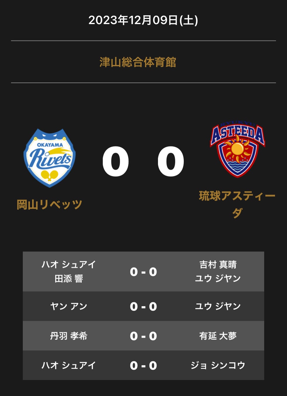 ノジマTリーグ 2023-2024シーズン 公式戦 12月9日開催 岡山リベッツ vs 琉球アスティーダ 対戦オーダー発表
