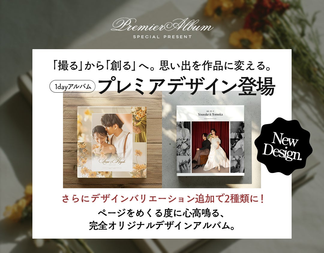 この度、20代花嫁に人気のウェディングフォトプラン「1dayアルバム plan」をさらに充実させる、特別なアルバムオプション「プレミアデザイン」の提供を開始します。憧れと特別感、そしてトレンドを取り入れたデザインで、一生に一度の思い出を、よりドラマチックで洗練された「アート作品」として残します。