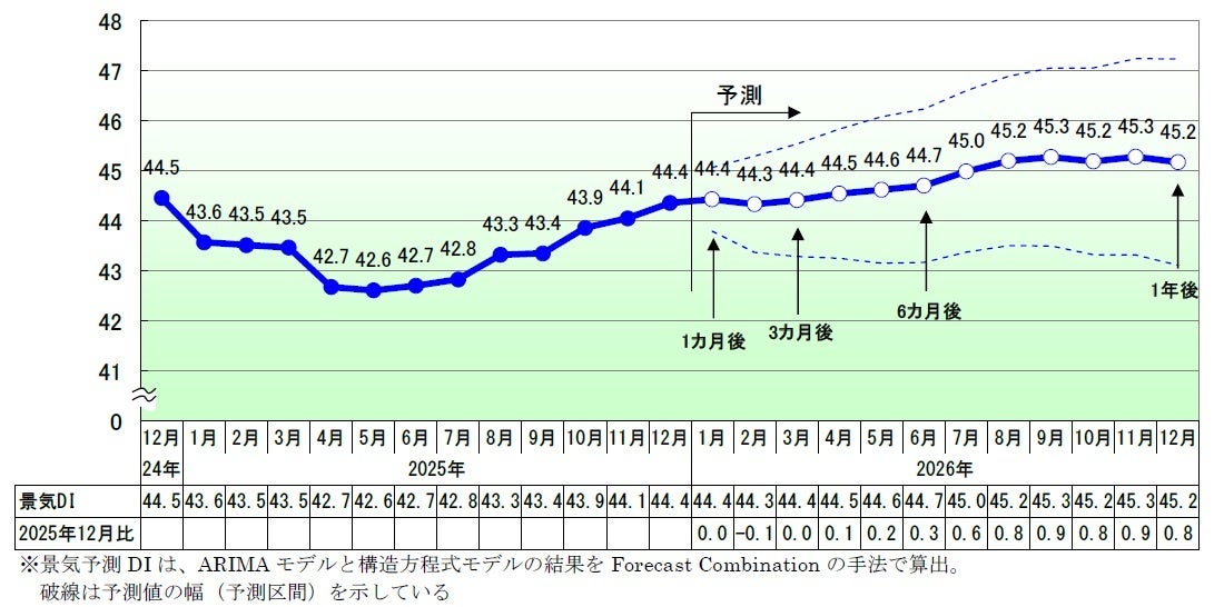 2025年12月の景気DIは前月比0.3ポイント増の44.4となり、2017年12月以来8年ぶりに7カ月連続で改善した。国内景気は、活発な季節需要や好調なAI関連が押し上げ要因となり、改善傾向が続いた。