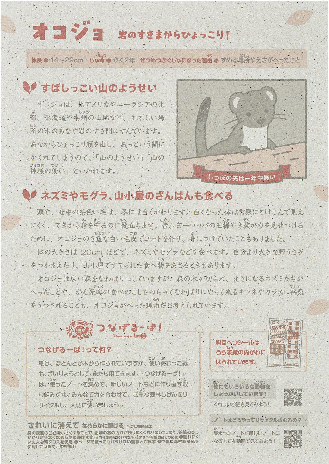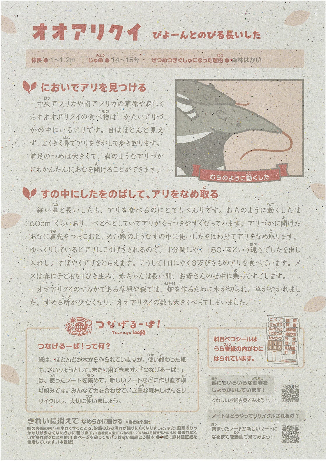 コクヨグループでは、マテリアリティの1つに「循環型社会への貢献」を掲げ、多くのパートナーや顧客とともに資源循環のための一歩をつなぎあわせ「捨てない社会」をリードすることを目指しています。「つなげるーぱ!」はコクヨ株式会社とEコマースサービスを提供する株式会社カウネット(本社:東京港区/代表取締役社長:宮澤 典友)を含むコクヨグループが、小学生が集めた使用済みのノートをリサイクルし、表紙材料に再利用した新しいノートを再び児童やお客様のもとに届ける活動です。今回、活動の一環として生まれた小学生向けのノート「キャンパスノート<つなげるーぱ!>」第3弾として絶滅危惧種をあしらった4柄パックを発売します。