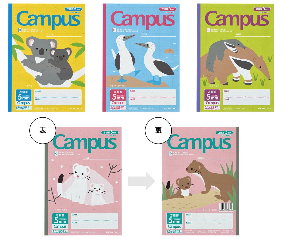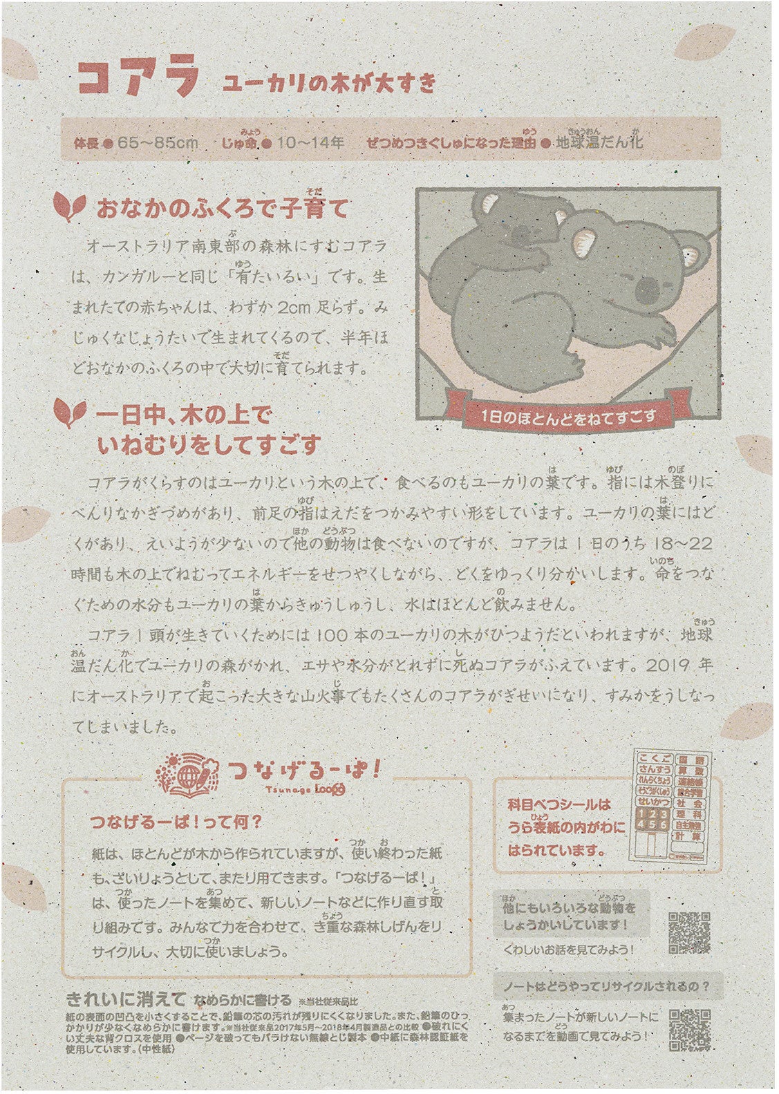 表紙はコアラ、アオアシカツオドリ、オオアリクイ、オコジョの4柄です。地球環境保全の学びにつながることを意図して、絶滅危惧種に指定されている動物を採用しています。表紙と裏表紙で異なるイラストを見比べることで新たな発見や学びを得ることができます。
