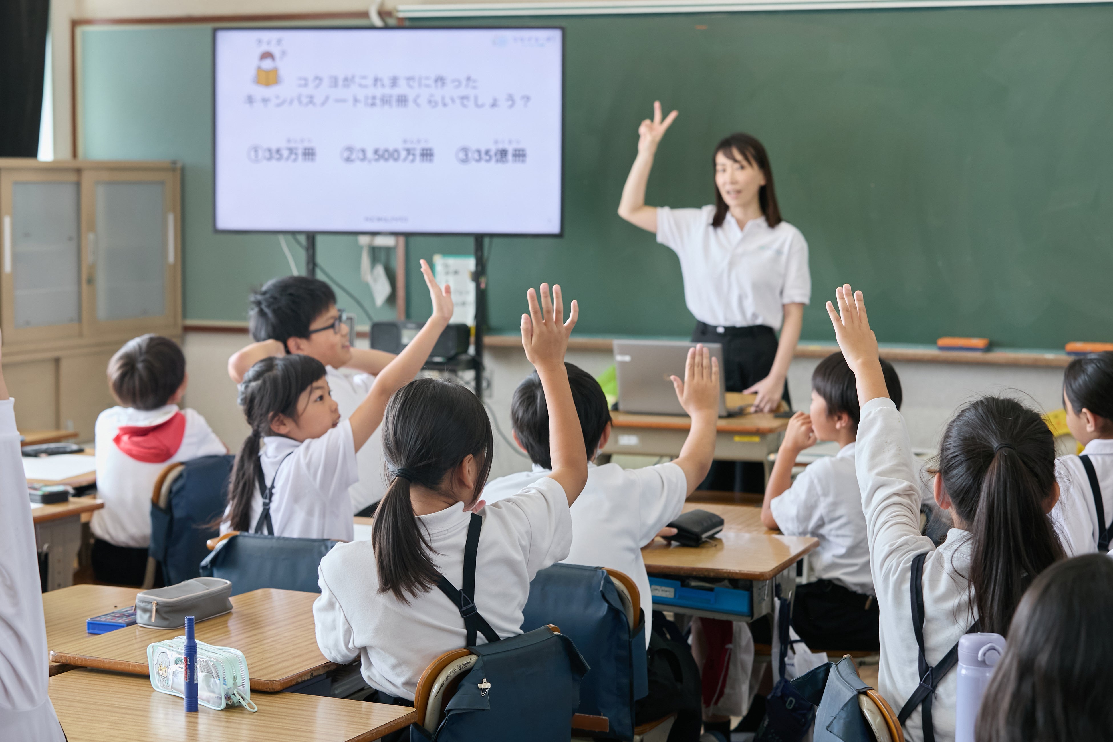 「つなげるーぱ!」とは、地球環境の保全を考える環境学習プログラムです。コクヨグループ社員自ら、子どもたちが資源循環や地球環境の保護について学ぶことができる出張授業を行っています。使い終えたノートを子どもたちとコクヨが協働で回収し、再びノートの一部の原料として生まれ変わった製品を手にするプロセスを通じて、持続可能な未来を作る体験を提供しています。