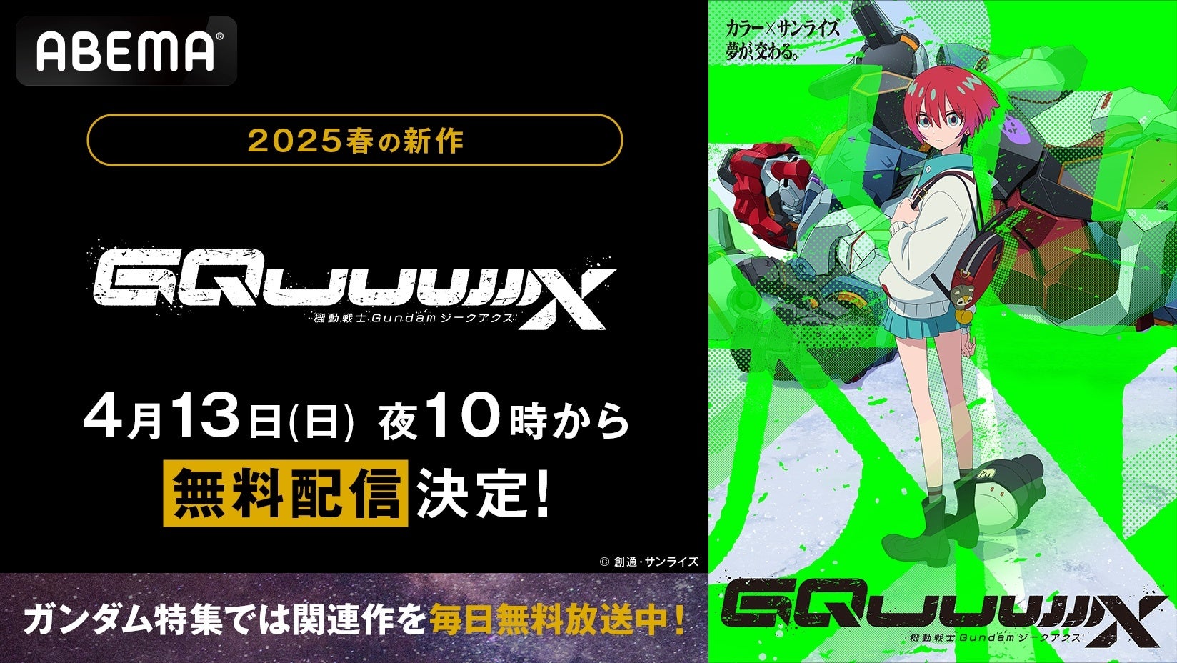 このたび「ABEMA」にて、『機動戦士Gundam GQuuuuuuX(ジークアクス)』の無料放送が決定いたしました。2025年4月13日(日)から毎週日曜日夜10時より、「ABEMAアニメチャンネル」「ガンダム特集」にて最新話を無料放送するほか、1週間の無料配信を開始。なお、「ABEMAプレミアム」「広告つきABEMAプレミアム」(※)なら、4月11日(金)から毎週金曜日夜10時よりいち早くお楽しみいただけます。
