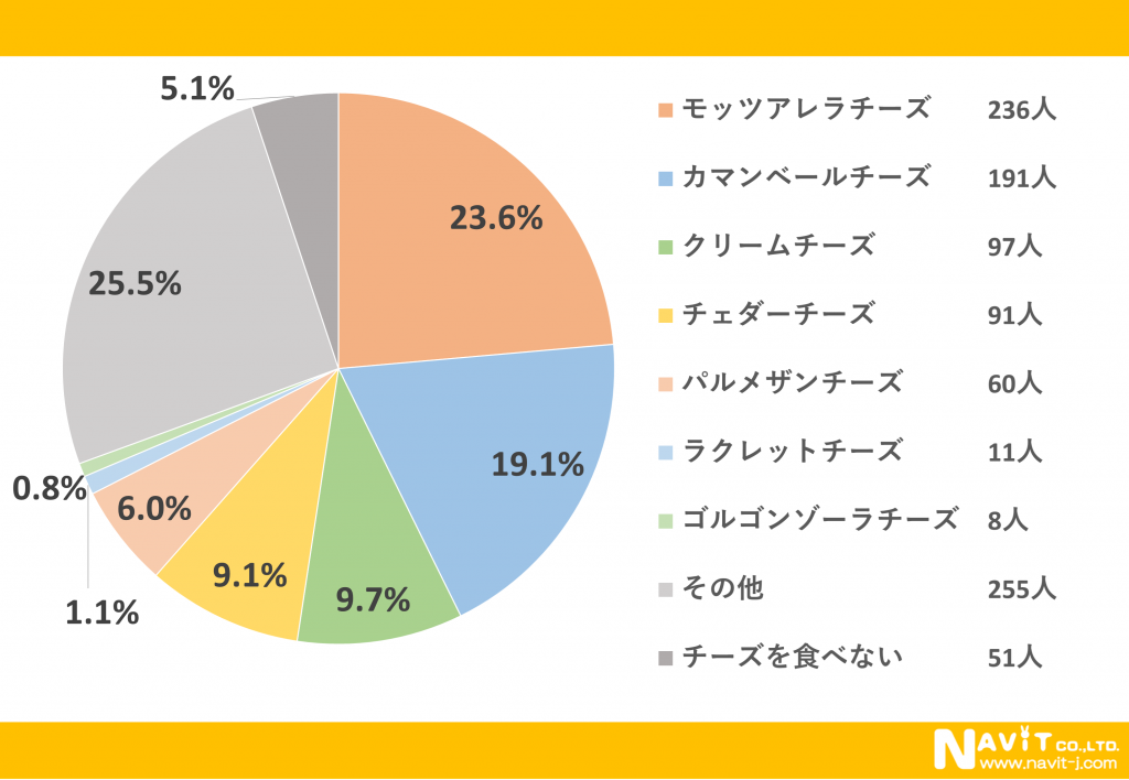 チーズの種類で1番人気があったのが「モッツアレラチーズ」で23.6%でした。次に人気だったのが「カマンベールチーズ」で19.1%、「クリームチーズ」が3番目で9.7%となっています。