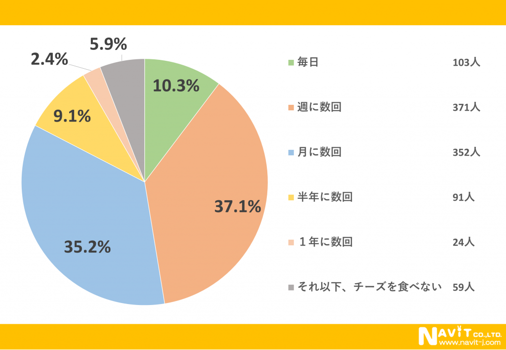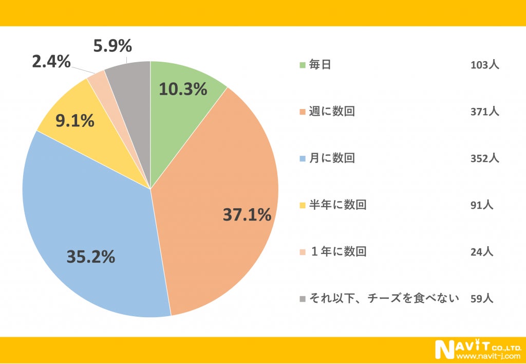 チーズをどのくらいの頻度で食べますか?という質問に対して1番多かった回答が「週に数回」という方が37.1%で「月に数回」という方が35.2%、また「毎日」という方も10.3%いらっしゃいました。