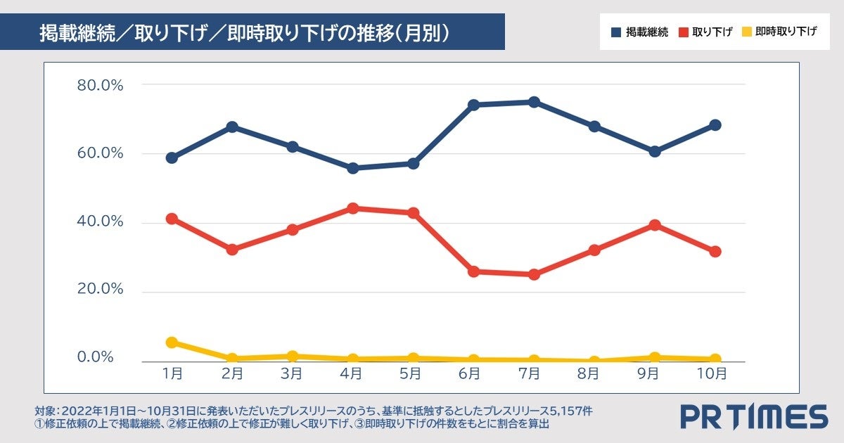 一方で、法令抵触リスクが高い内容や、成年向け商品に関する内容など、生活者に重大な影響を与えかねないプレスリリースは、修正依頼を行わず、運営者判断で即時取り下げを決行する場合があります。即時取り下げを行ったプレスリリースは、60件と、基準に関する指摘を行ったプレスリリースの1.2%でした。