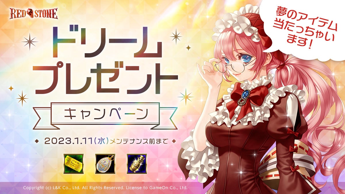 株式会社ゲームオン[本社:東京都渋谷区、代表取締役社長:文 智秀(ムン ジス)]は、オンラインRPG『RED STONE(レッドストーン)』において、「RED’s トリプルドリーム年末祭」の第2弾として、「ドリームプレゼントキャンペーン」を2022年12月21日(水)より開始いたしました。