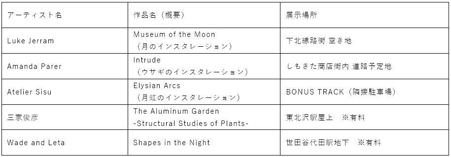 中秋の名月の美しい夜空の下、上記のメインアートを中心に巡っていただくことで、世界的な芸術などを身近に感じながら東北沢~世田谷代田のいわゆるシモキタエリアの散策をお楽しみいただけます。