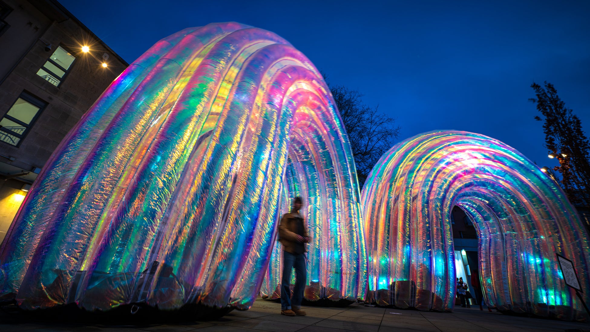 シンボル作品として3年連続で登場するのは、「下北線路街 空き地」に展示される、Luke Jerram(ルーク・ジェラム:英)が手掛けたNASAの月面写真を基とした直径7mの「Museum of the Moon」です。月のクレーターの細部まで表現された精巧な作品が、今年も下北沢の街を静かに照らします。「しもきた商店街内 道路予定地」では、Amanda Parer(アマンダ・パーラー:豪)が手掛けるウサギの姿を模した「Intrude」が登場し、いまにも動き出しそうな巨大なウサギが街中に活気を与え、ユニークな写真撮影スポットに。また、日本初展示の作品として「BONUS TRACK」隣接駐車場には、アーティストグループAtelier Sisu(アトリエ・シス:豪)による、月虹を連想させるアーチ状の作品「Elysian Arcs」が展示されます。作品の中を通り抜けることで、視覚だけでなく触覚や空間感覚も刺激され、全身で幻想的な空間を体験できます。