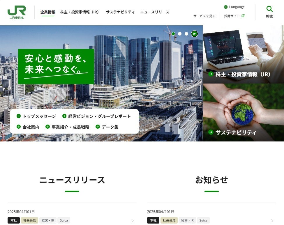 JR東日本は、当社グループの経営方針や施策を分かりやすく発信し、ステークホルダーの皆さまのご理解を深めるため、ホームページのリニューアルを進めています。