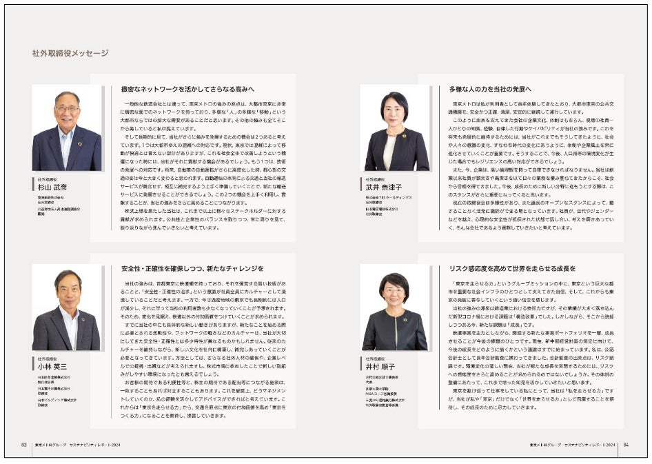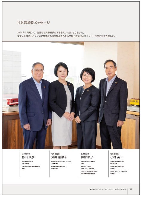 今回のレポートでは、人権デュ-・ディリジェンスの実施や「東京メトログループカスタマーハラスメント対応ポリシー」の策定などの人権尊重に向けた取組み、丸ノ内線、南北線で使用する全電力を新たに再エネ化したこと等の脱炭素・循環型社会実現に向けた取組みなどについて紹介しています。また、今年度から、当社のガバナンスに重要な外部の視点をもたらす社外取締役のメッセージを新たに掲載しています。さらに、このたびの株式上場を踏まえ、英語版(日本語版の抜粋版)も発行します。