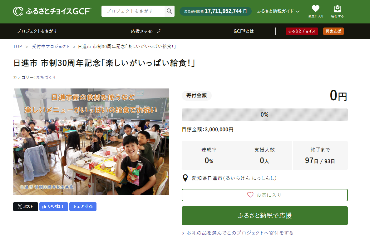 愛知県日進市とふるさとチョイス、ふるさと納税制度を活用したガバメントクラウドファンディング®で、日進市内の小中学校の学校給食における市制30周年記念メニュー提供費用を募るプロジェクトを開始