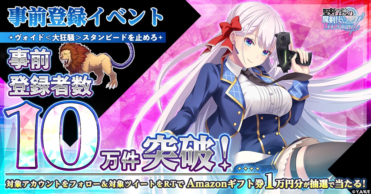 「聖剣学院の魔剣使い メメントメモリア」は、事前登録10万件を達成しました。この達成を記念し、合計10,000円分のキャンペーン報酬を解禁いたします。リリース時にも豪華なキャンペーンを行いますのでお楽しみにお待ち下さい!