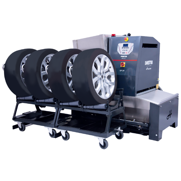 ホイールトロリーにタイヤ・ホイールをセットするだけで4本連続の自動洗浄が可能に。