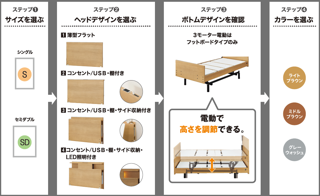 ヘッドボードの種類は4種類、色も3色からお選びいただけますので、暮らし方や好みに合わせて24通りの組み合わせから選んでいただくことができます。