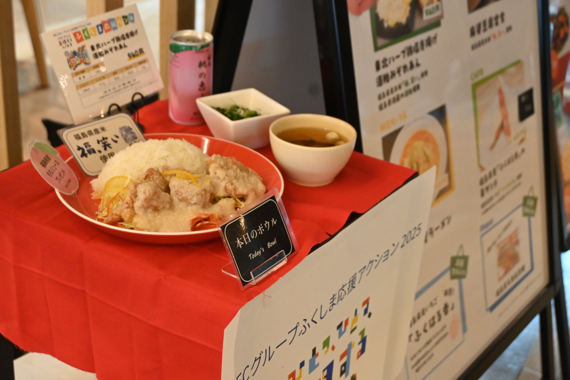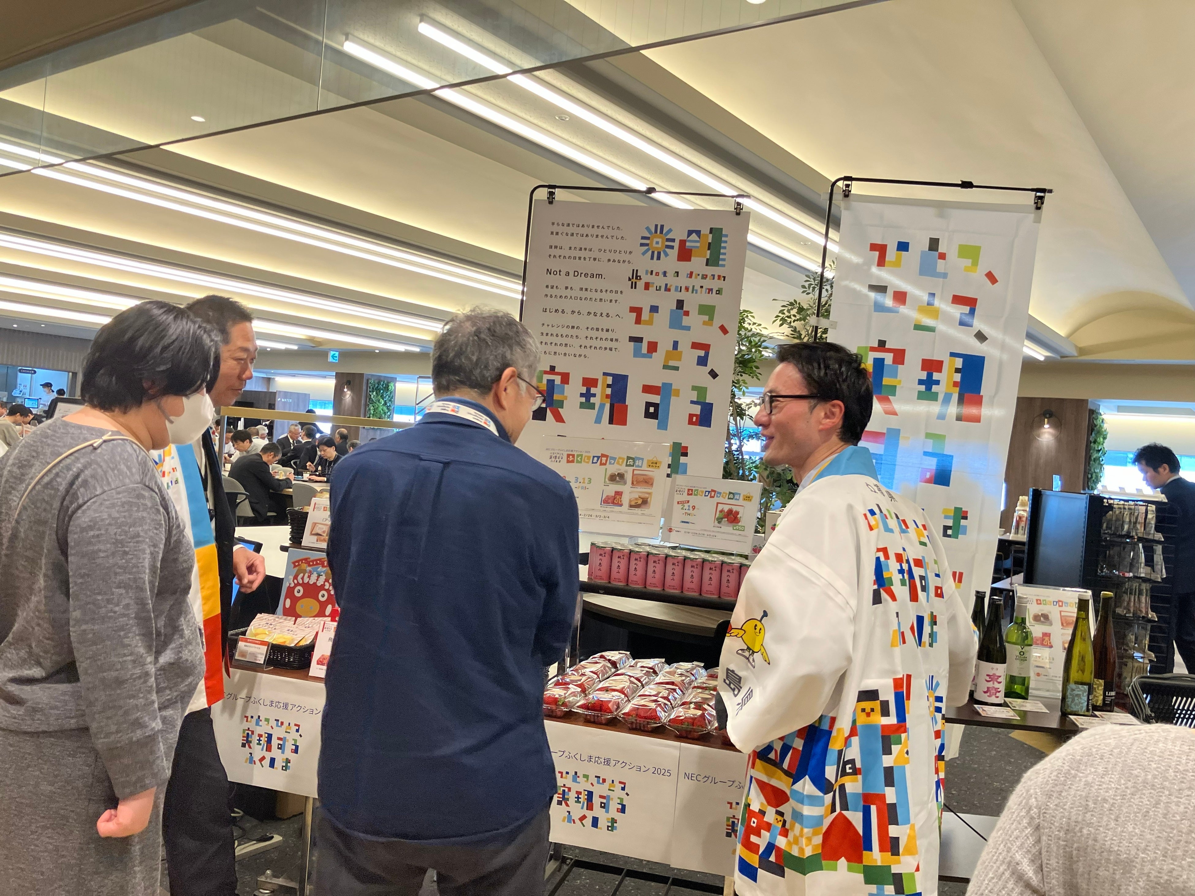 福島県産食材を活用したランチの提供および県産品の販売を実施。初日の2月19日には、NEC本社ビルにおいて福島県職員と社員食堂・売店での呼び込みを行うとともに、社員食堂内で「3.11東日本大震災追悼映像」を紹介し、本取り組みへの参加を呼びかけ。