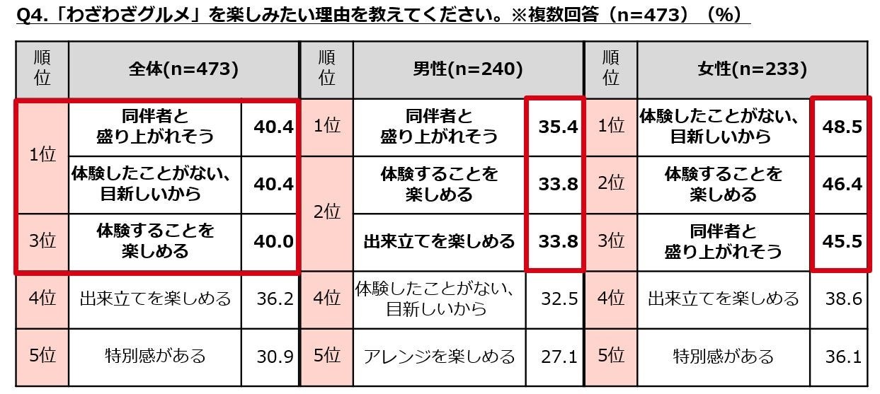 「わざわざグルメ」とは、飲食店で来店客自身が料理を仕上げたりドリンクを作るなど、楽しみながら体験できるグルメのことです。調査結果の詳細は以下の通りです。