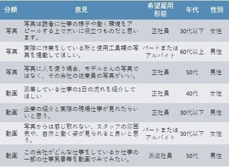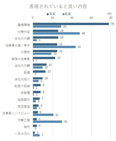 「動画」で最も多かったのは「仕事内容」について(48件)、次いで「従業員の働く様子」(44件)、「作業工程」(30件)となった。写真とは違い一連の流れを視聴できることから、「作業工程」を求める意見が目立った。また、「従業員インタビュー」(21件)も動画の特徴を活かせるとして多くの意見が集まった。