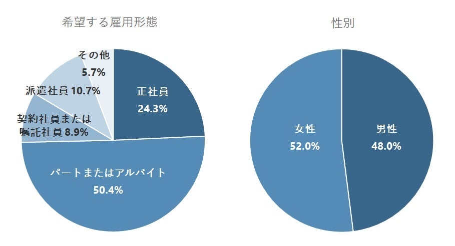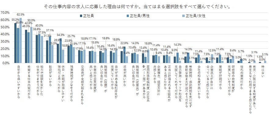 一方、「女性」のほうが「男性」よりも「自宅から通いやすいから」が13.9pt、「雇用形態転換制度(正社員⇔パート等)があるから」が10.2pt、「企業風土が自分に合っていると感じたから」が9.6pt高くなった。無理なく勤められる場所や、就業を制限(又は拡張)する場合柔軟に対応してもらえる職場が好まれているようだ。
