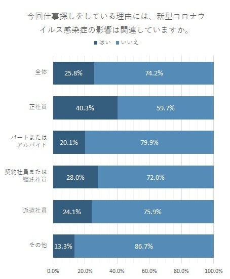 全体で25.8%が「はい」と回答し、新型コロナウイルス感染症の影響を受けて仕事探しをしていた割合は3割未満になった。