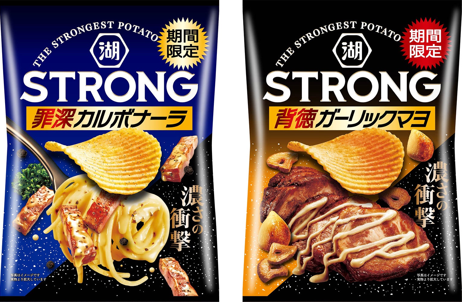 ガツンと濃厚!湖池屋の“背徳グルメ”が登場!「湖池屋STRONG ポテトチップス 罪深カルボナーラ/背徳ガーリックマヨ」