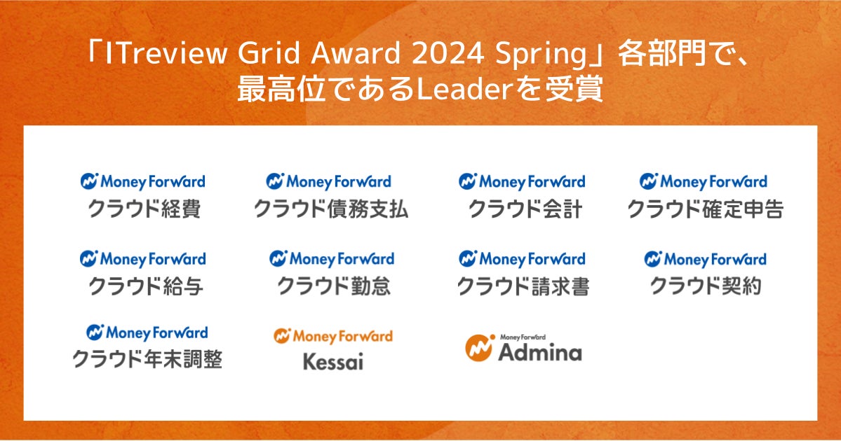 マネーフォワードグループが提供する11プロダクトが、アイティクラウド株式会社主催「ITreview Grid Award 2024 Spring」の各部門にて、最高位である「Leader」を受賞しました。今回受賞したプロダクトは、株式会社マネーフォワードのバックオフィスSaaS『マネーフォワード クラウド』の9プロダクト、マネーフォワードケッサイ株式会社の企業間後払い決済・請求代行サービス『マネーフォワード ケッサイ』、マネーフォワードi株式会社の情シス向け業務OS『マネーフォワード Admina』です。