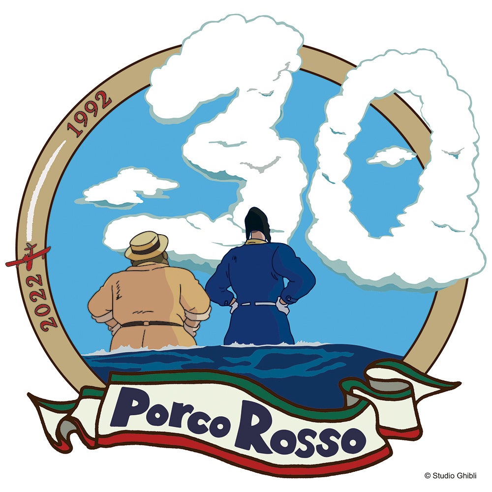 アドリア海の空に浮かぶ“30“の雲を眺め背中で語るポルコとカーチス。二人の飛行艇乗りの決闘を締めくくるシーンをモチーフに、イタリア国旗色のリボンに作品タイトルをあしらい、ポルコの愛機である”サボイアS-21“が1992から2022の数字を駆け抜けていきます。「カッコイイとは、こういうことさ。」という作品のキャッチコピーと情景を想起させる、公開30周年限定のデザインです。