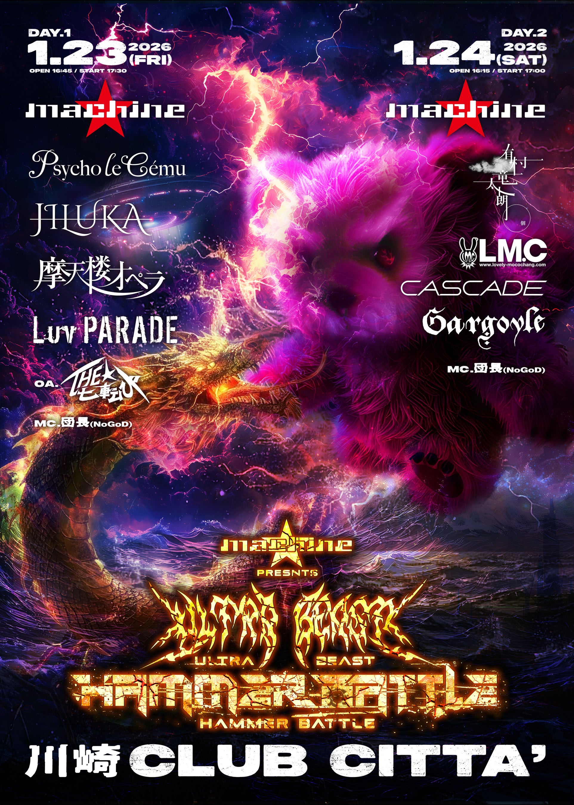 machine主催、摩天楼オペラ、Gargoyle、CASCADE、有村竜太朗等出演「ULTRA BEAST HAMMER BATTLE」イベントが、1/23・24の2日間に渡りニコ生で配信決定!