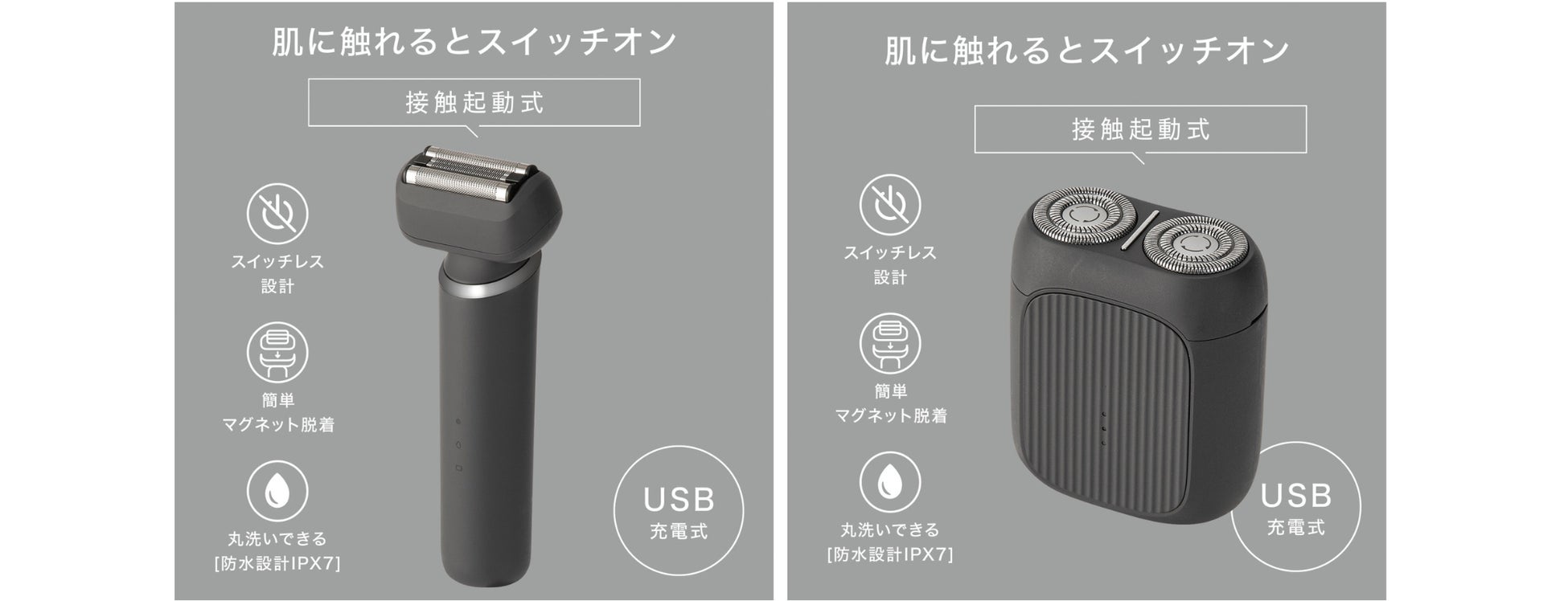 「接触起動式」のスイッチレス設計や丸洗い可能な防水機能(IPX7)を搭載し、シェービングの快適さと使いやすさを追求。用途や好みに合わせて選べる2商品展開で、毎日の身だしなみをサポートします。