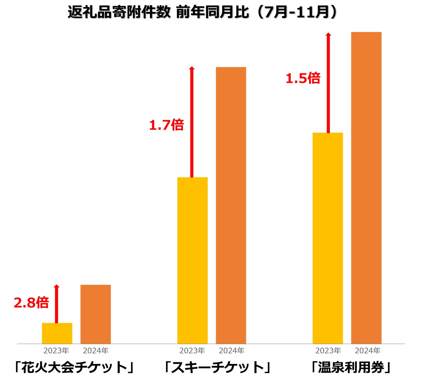 2024年は旅行・レジャー消費が活発になり、“コト消費”への投資が一層注目を集めた1年となりました。下半期の寄附傾向においても、「スキーチケット」や「花火大会チケット」、「温泉利用券」など、体験型返礼品を選ぶ寄附者が増加しています。特に夏から冬にかけては家族で楽しめるレジャーが多いことから、夏休み・冬休みを利用した家族旅行の一環としてふるさと納税を活用する方が多いのではないでしょうか。