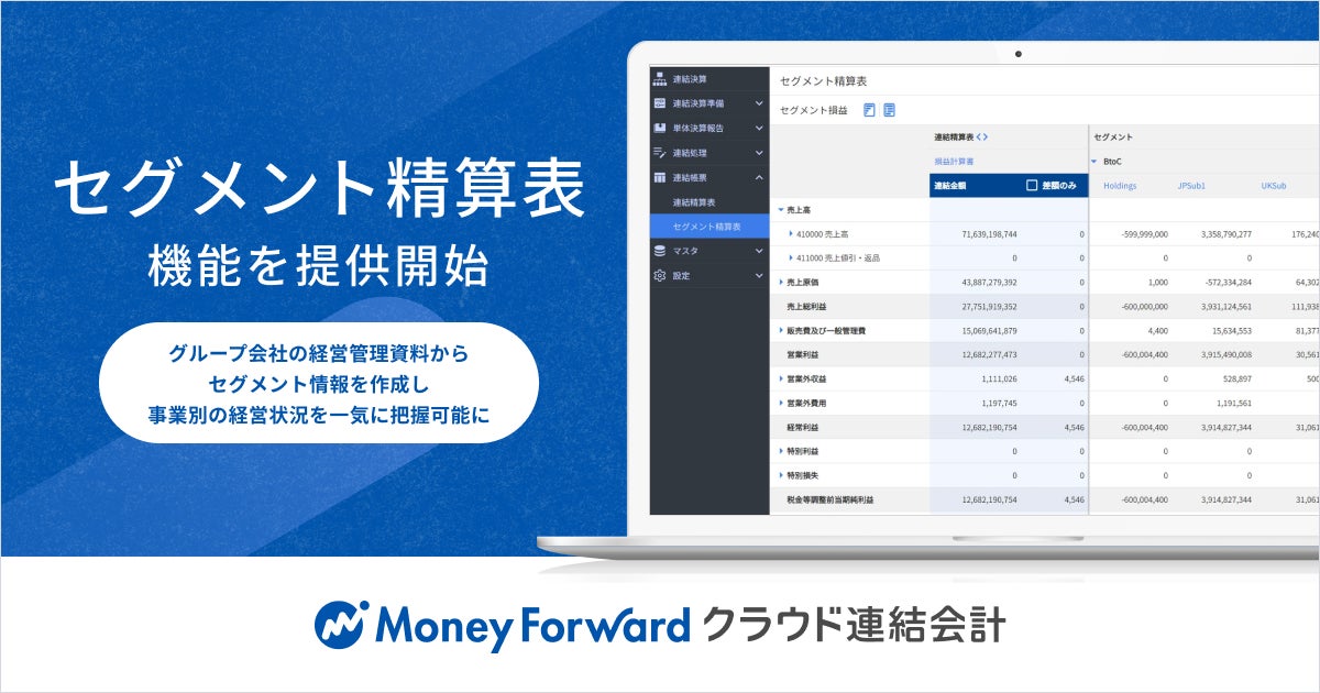 株式会社マネーフォワードは、『マネーフォワード クラウド連結会計』において、「セグメント精算表」機能を提供開始しました。これにより、グループ各社の経営管理資料を『マネーフォワード クラウド連結会計』に取り込むことで、簡単にセグメント情報を作成できます。そのため、事業別の連結金額や単体金額、連結損益計算書との差額などを一気に把握することが可能になります。