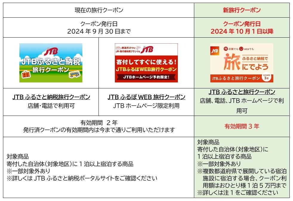 ふるさと納税サイト「ふるぽ」を運営する株式会社JTBは、ふるさと納税の返礼品で、寄付をした自治体への旅行に利用できる「旅行クーポン」を2024年10月1日(火)にリニューアルします。