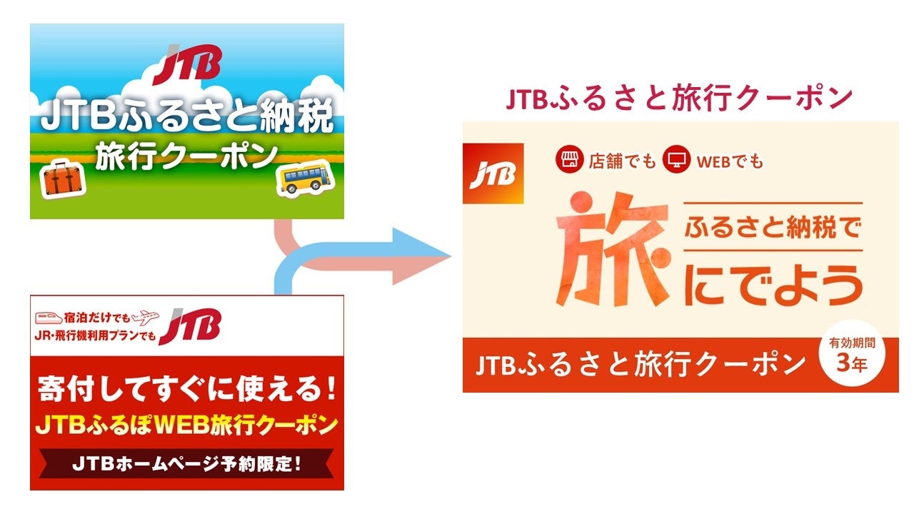 これまでは店舗予約および電話予約で使用できる「JTBふるさと納税旅行クーポン」と、JTBホームページでの予約に使用できる「JTBふるぽWEB旅行クーポン」と、予約方法によって旅行クーポンが分かれていました。今回リニューアルする「JTBふるさと旅行クーポン」は、これまでの2種類の旅行クーポンを統合し、店舗予約、電話予約、JTBホームページと予約方法に関わらず使用可能となります。また、有効期間もこれまでの2年間から3年間に変更し、寄付者にとって利便性が向上します。