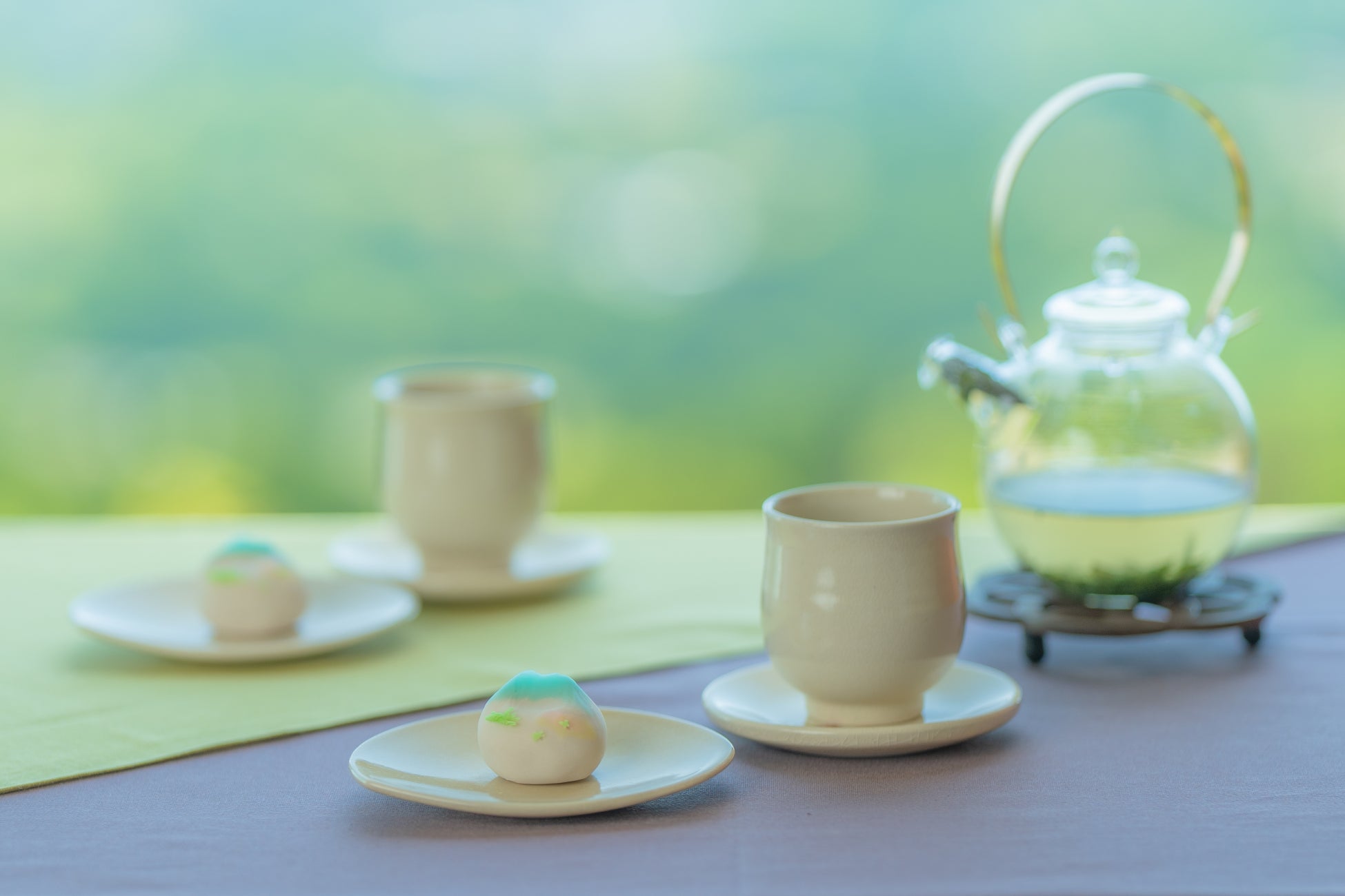 オプションとして、鹿児島県姶良(あいら)市にある御菓子司「あじ福」による界 霧島オリジナル上生菓子と、霧島茶のセット「茶一杯(ちゃいっぺ)」を楽しめます。優しい口当たりとほのかな甘みが特徴の煎茶を、春の陽気になぞらえて選定しています。さらに、薩摩焼の名家である沈壽官(ちんじゅかん)窯の茶器を揃えました。鹿児島県で受け継がれる文化に新茶を介して向き合う、上質なお茶の時間です。