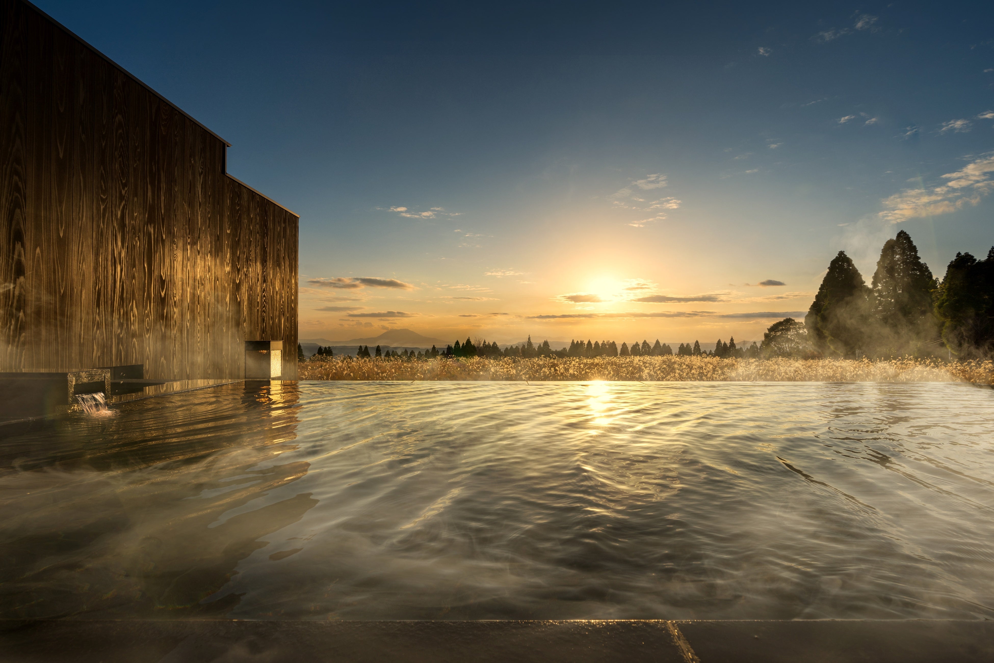 神話が息づく高千穂峰の中腹に建ち、全ての客室から桜島を見下ろす開放的なビューが広がります。スロープカーで下りた草原には湯浴み小屋が佇み、霧島高原を見晴らす景観を眺めながら、心身ともに開放される温泉旅館です。天孫降臨を表現した躍動感ある演舞も見どころです。