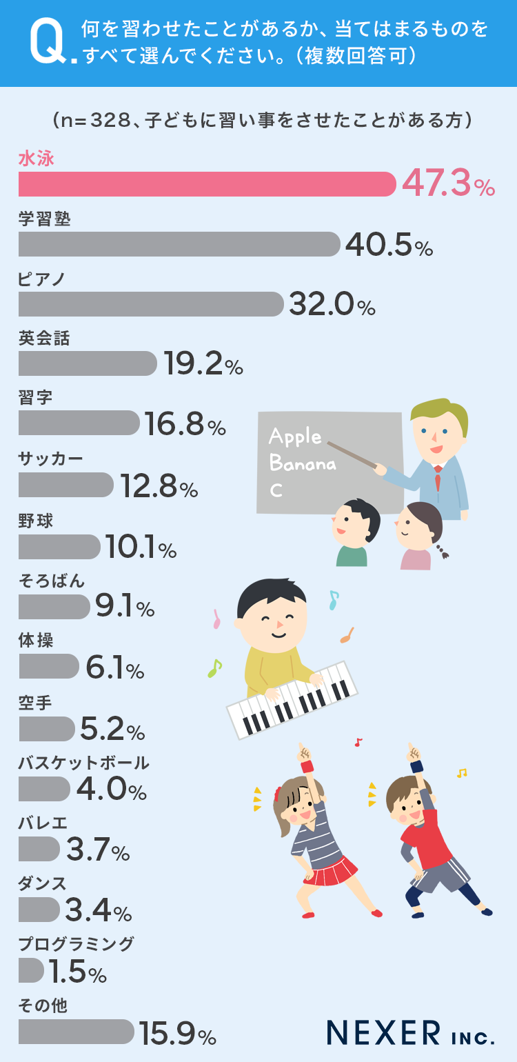 水泳が47.3%、学習塾が40.5%、そしてピアノが32%と続きました。