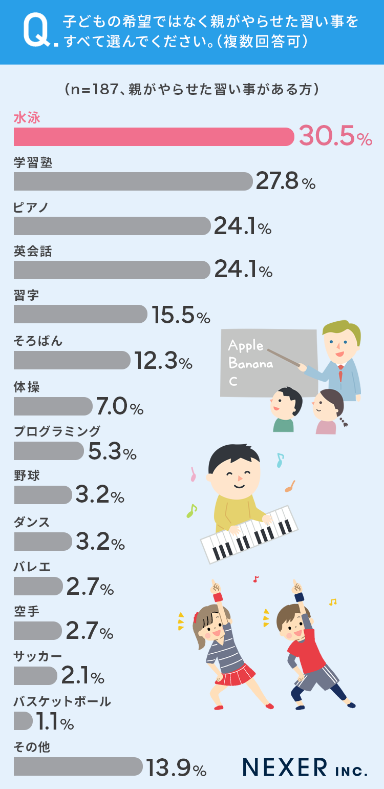 親がやらせた習い事第1位は「水泳」で、30.5%でした。