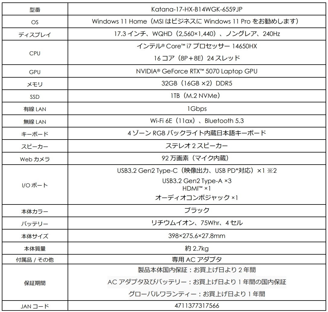 ・Katana 17 HX B14Wシリーズ製品ページ:https://jp.msi.com/Laptop/Katana-17-HX-B14WX