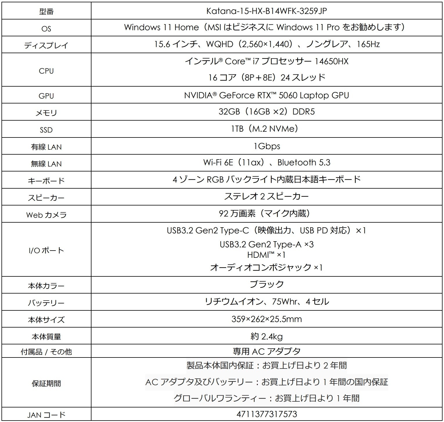 ・Katana 15 HX B14Wシリーズ製品ページ:https://jp.msi.com/Laptop/Katana-15-HX-B14WX