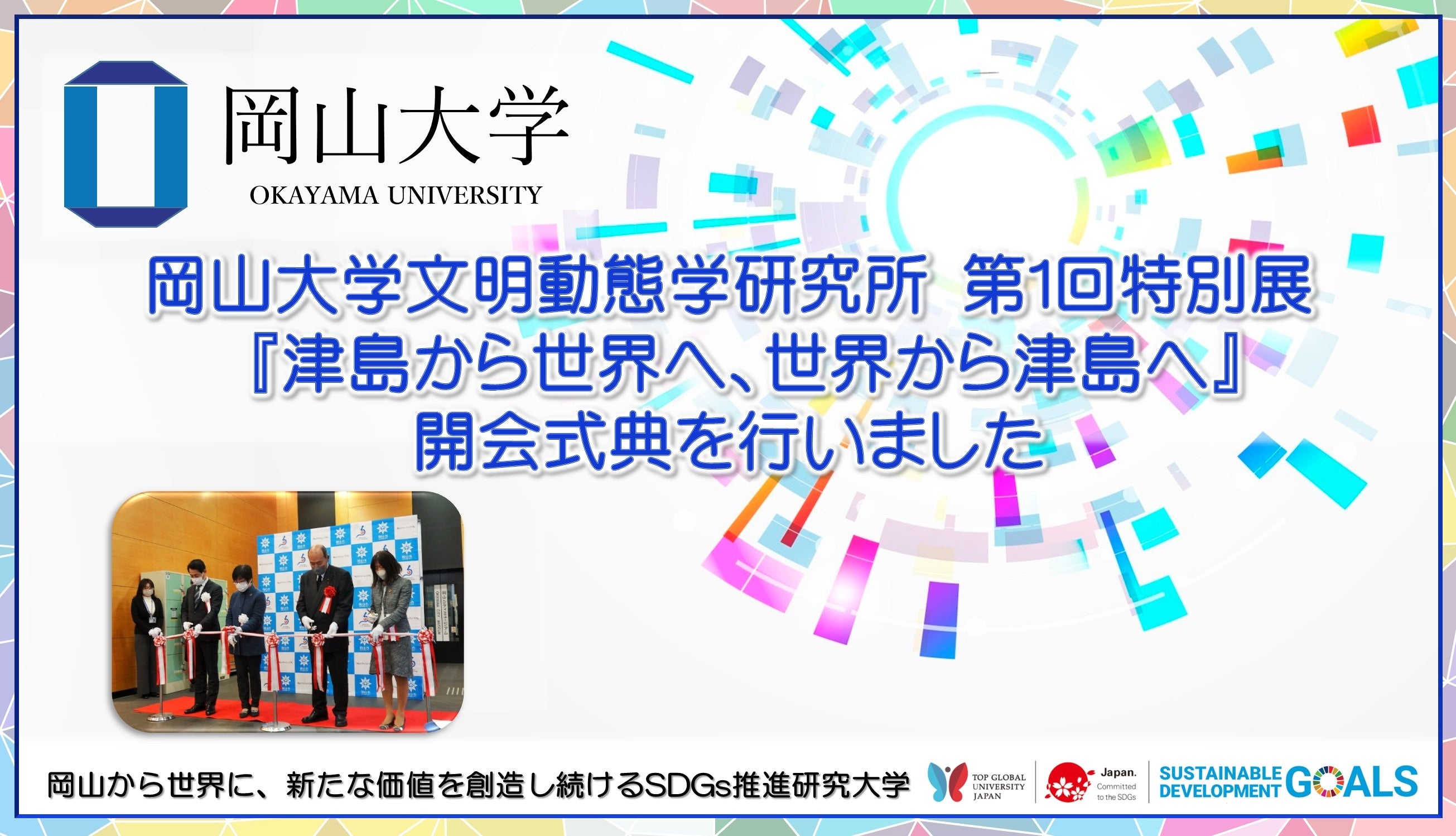 国立大学法人岡山大学(本部:岡山市北区、学長:槇野博史)の文明動態学研究所は、JR岡山駅前にある岡山シティミュージアム(岡山市北区)にて開催される「岡山大学文明動態学研究所第1回特別展『津島から世界へ、世界から津島へ』開会式典」を、2023年2月12日に同ミュージアムにて開催しました。
