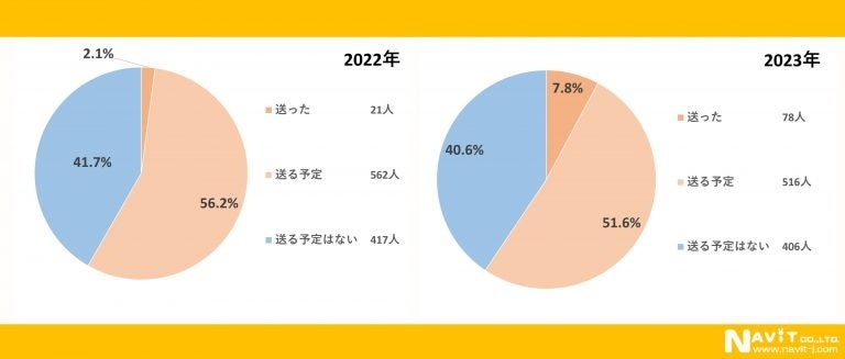 来年(2024年)、年賀状を送りますか。という質問に対して昨年同様に1番多かったのが「送る予定」で昨年より4.6%減っているものの2023年は51.6%となっています。