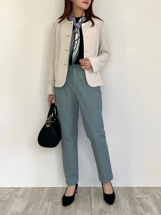 セレモニーで着たジャケットを、お仕事仕様にブラッシュアップ。春らしいグリーンのパンツに、同系色のスカーフをプラスして統一感のある着こなしに。グリーンが持つ安心感・成長を感じさせるパワーで、仕事も快適に進みそう。