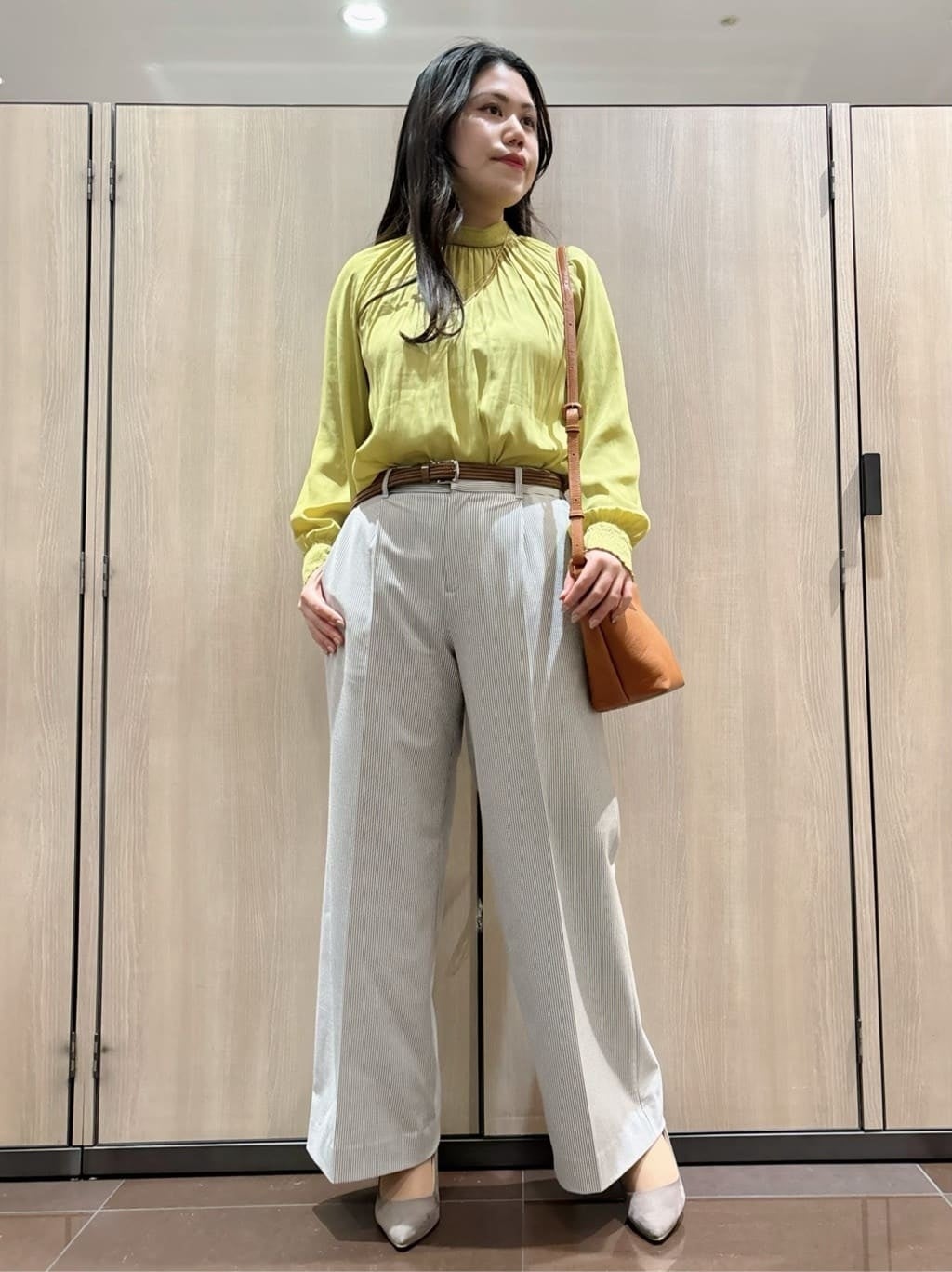 目にも鮮やかなイエローのブラウスなら顔周りを明るく演出してくれ、生き生きとして活発な印象に。纏うだけで自然と背筋も伸びそうです。ブラウスの色を引き立たせるために、ボトムは淡色でまとめると季節感にもぴったり。