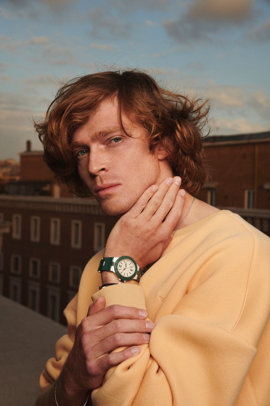 今年発売となる「ブルガリ アルミニウム マッチポイント 限定モデル」のカジュアルなスタイルとモダンな美しさはテニス愛好家の人たちにはとくに魅力的に映るはずです。スポーティな空気をまとったこのタイムピースは好きなスポーツを極める楽しさを身近なものにしてくれます。クラブハウスだけでなくコート上でも着用しやすいグリーンのカラーで、ベルクロ®ストラップと左手用リューズにより最高の着用感を実現します。