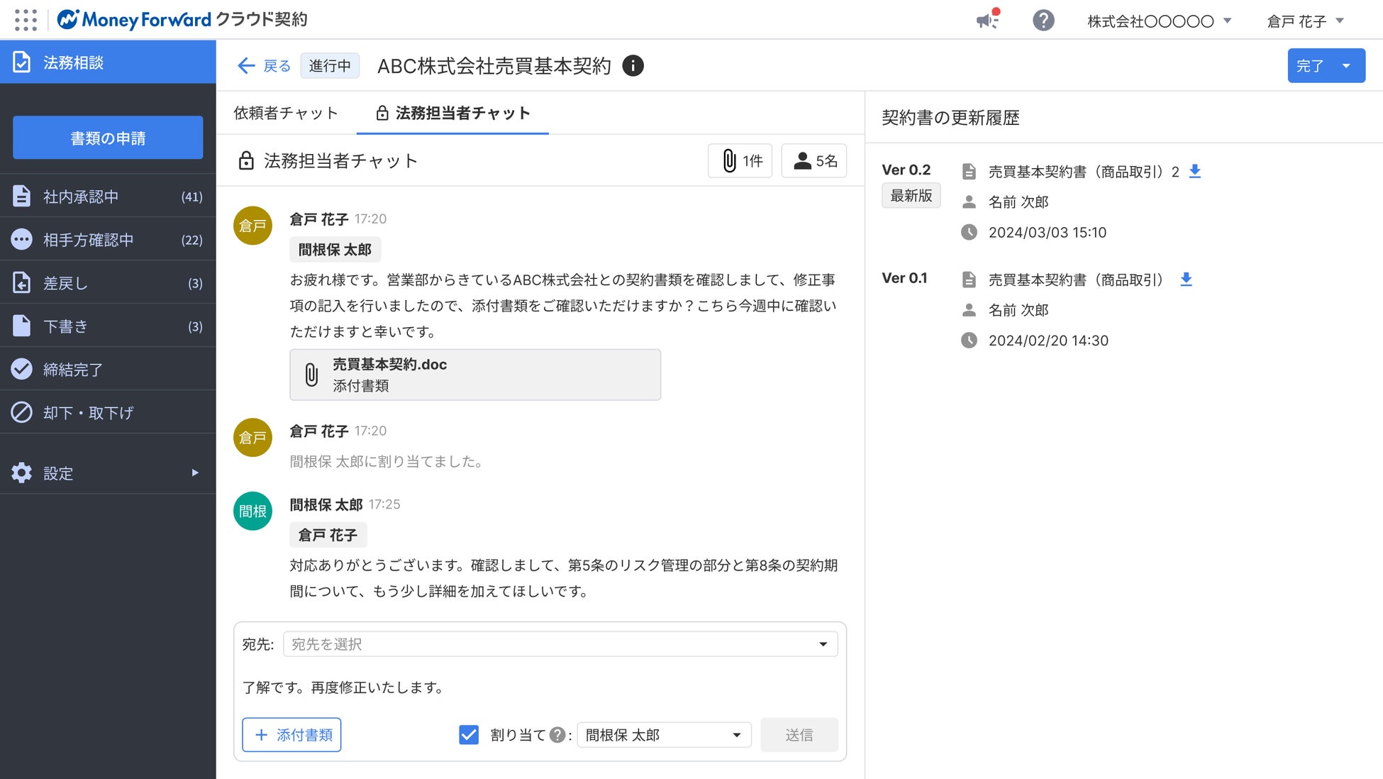 『マネーフォワード クラウド契約』、「法務担当者チャット」を提供開始