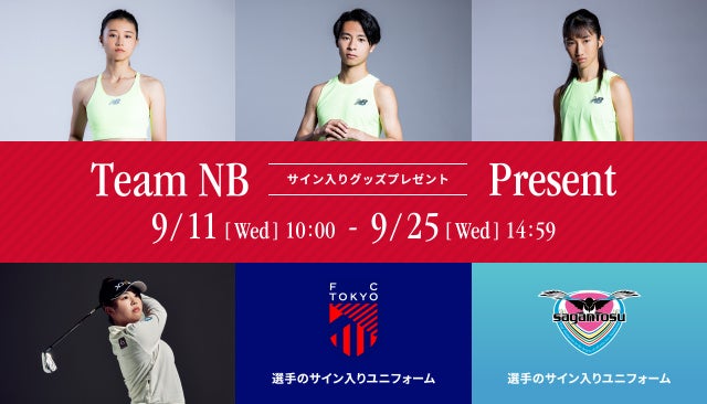 ニューバランスの契約アスリート、TeamNBの田中佑美選手、赤崎暁選手、田中希実選手、山下美夢有プロと、オフィシャルサプライヤー契約中のFC東京、サガン鳥栖の選手のサイン入りユニフォームを期間中にニューバランス公式オンラインストアにてご購入頂いた方に、抽選でプレゼントいたします。