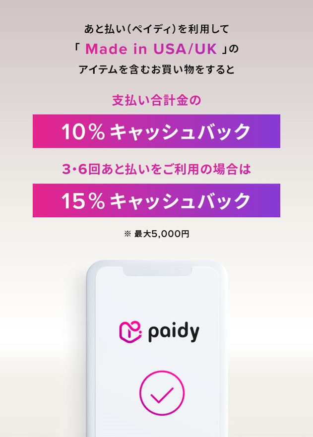 ペイディで「Made in USA/UK」のアイテムを含むお買い物をすると、支払い合計額の10%キャッシュバック。