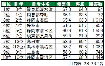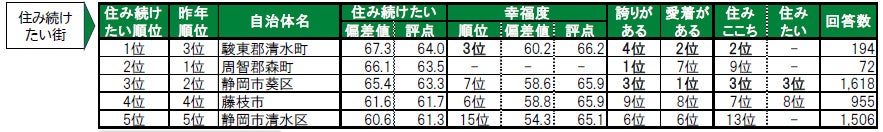 1位は駿東郡清水町で、「住みここち」で2位の街です。2位は、周智郡森町です。3位は静岡市葵区で、「住みここち」でも3位となっています。昨年から順位を上げてトップ10入りしたのは、7位島田市(昨年13位)、8位浜松市浜名区(昨年12位※)です。