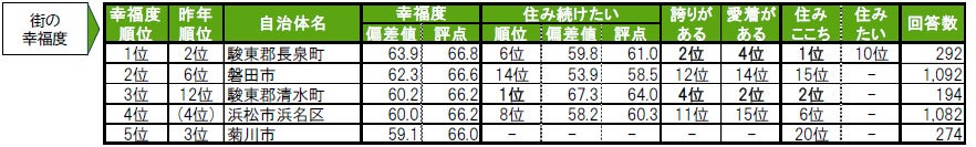 街の幸福度は、1位駿東郡長泉町、2位磐田市。3位は昨年12位の駿東郡清水町。