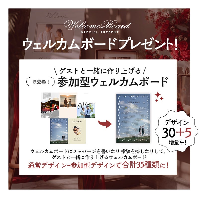 「世界にひとつ」の特別な一日を演出する、ウェルカムボードの最新トレンド。専属デザイナーによるオリジナルデザインがリニューアルし、ゲストと一緒に創る「参加型」デザインを含む全35種類で新登場しました。